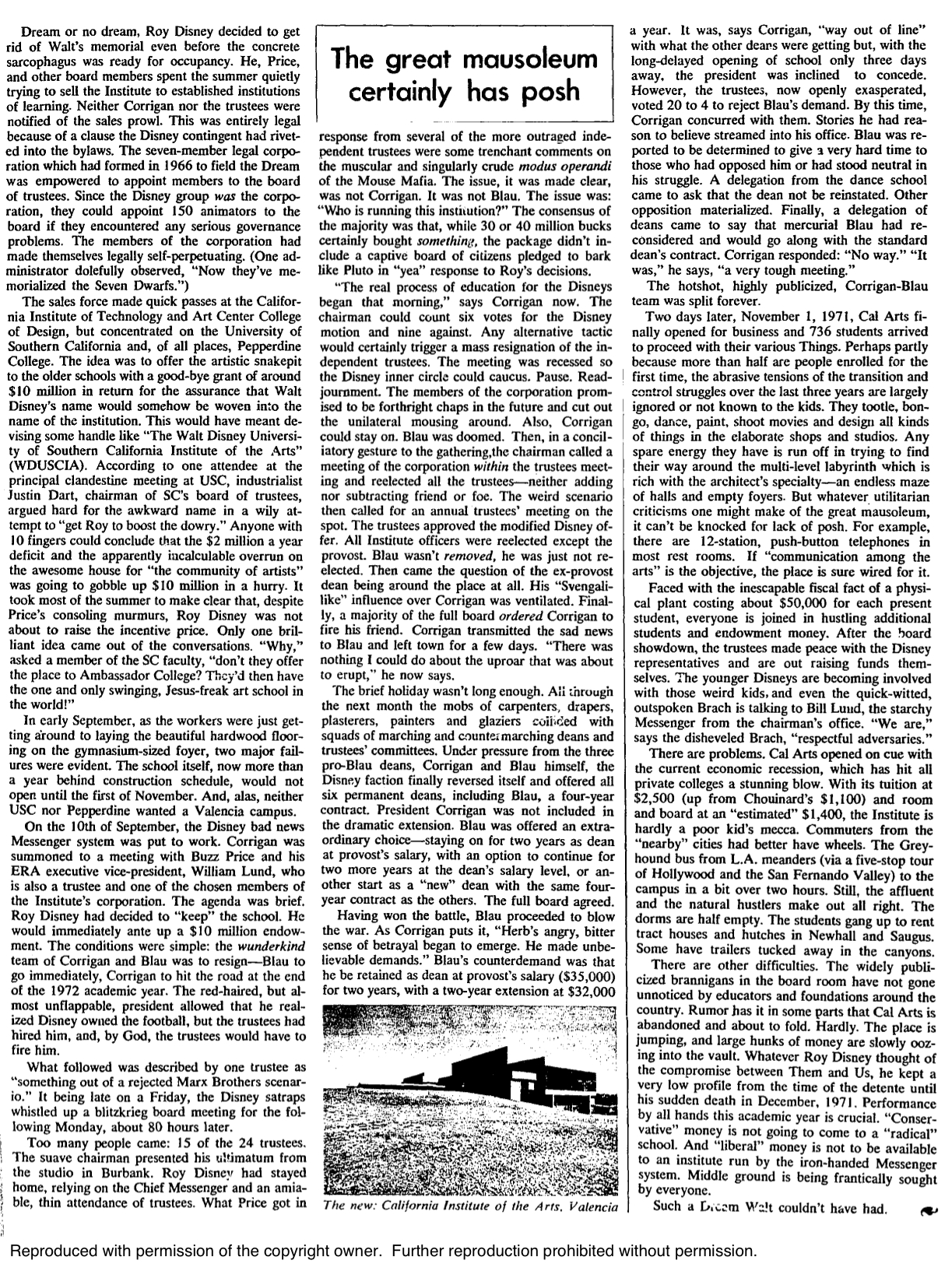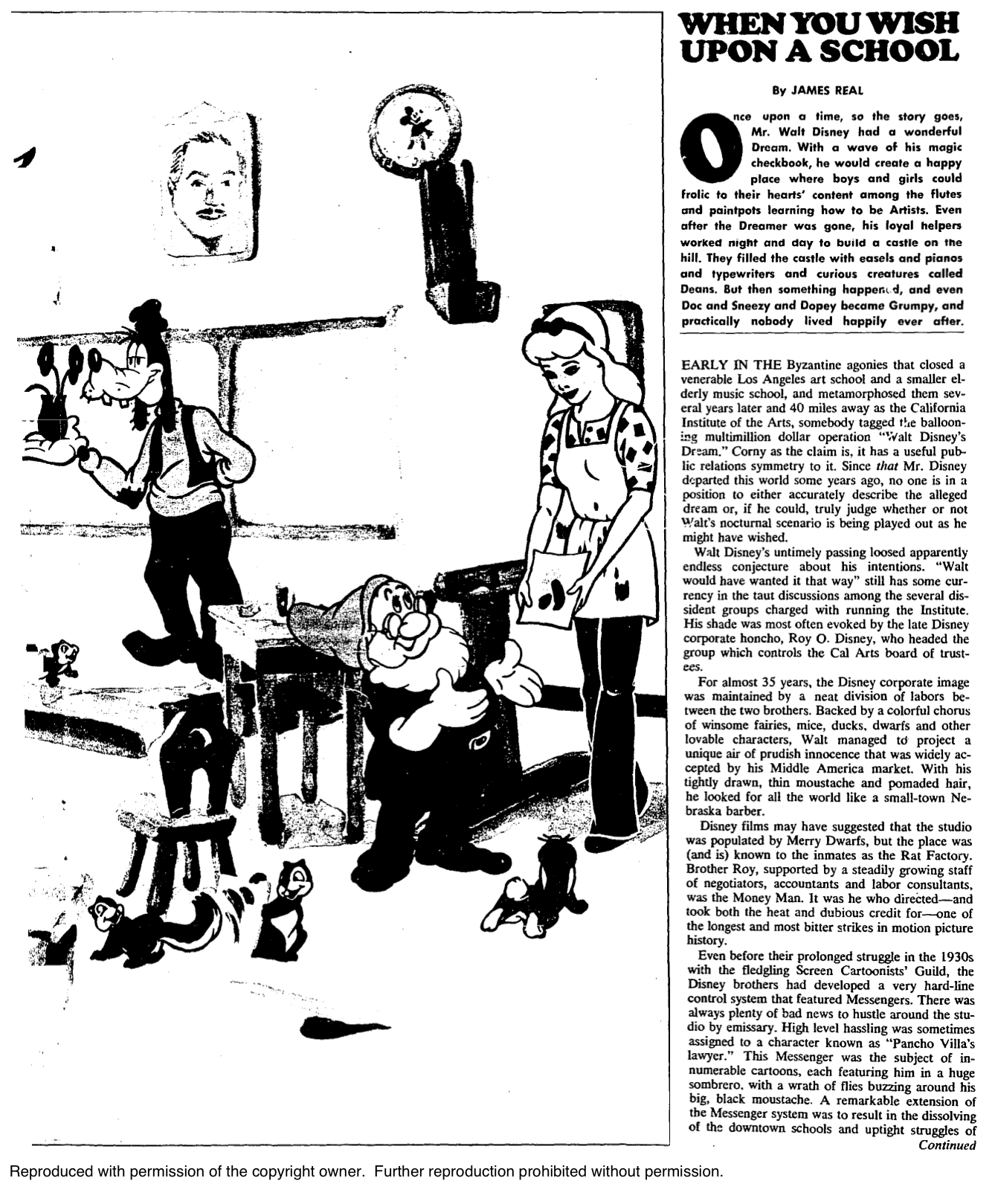 Through years of administrative problems including embezzlement, the Chouinard Art Institute was several weeks away from closing it’s doors in 1955 when Disney stepped in. Nelbert Chouinard signed the school over to him, he endowed the new non-profit with ten million dollars, and thus the California Institute of the Arts was born. He promised a hands-off approach which he honored, and which in fact was the primary reason for Chouinard’s massive productivity in the Postmodern movements of Westcoast Pop, Light and Space and Conceptualism which would flourish during it’s last run through the ’60s. Disney had envisioned a new, multi-disciplined school which would be a fertile, creative environment, cross-pollinating a wide range of disciplines from music to dance to art which in fact, began in the early 60s at Chouinard.