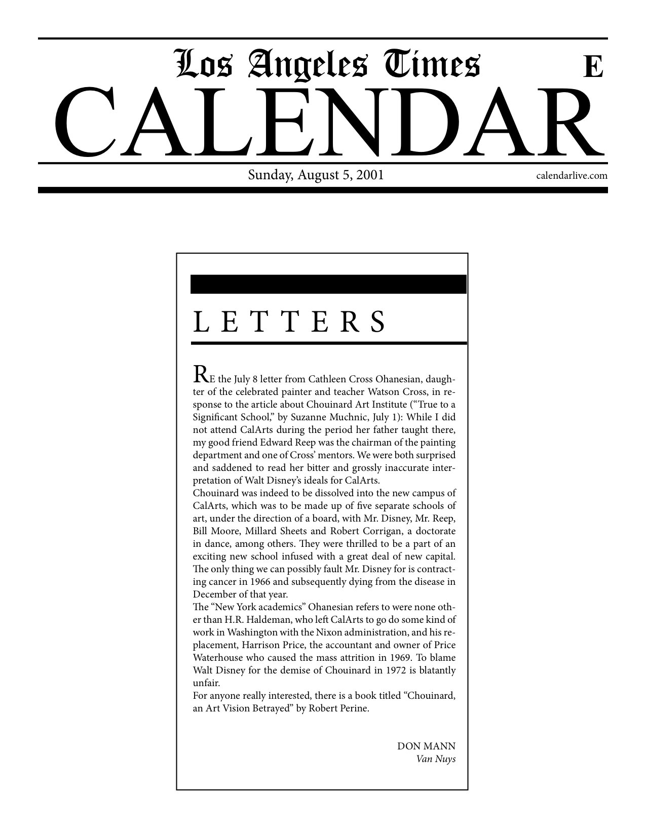 In the end, the new school known as Cal Arts would find it’s place on Disney land in Valencia and become a world force in art, music and performance – a testament to the enormous creative vision and will of Walt Disney as well as Nelbert Chouinard and Lula Von Hagen, the founder of the L.A. Conservatory of Music which was also part of the new evolution.
